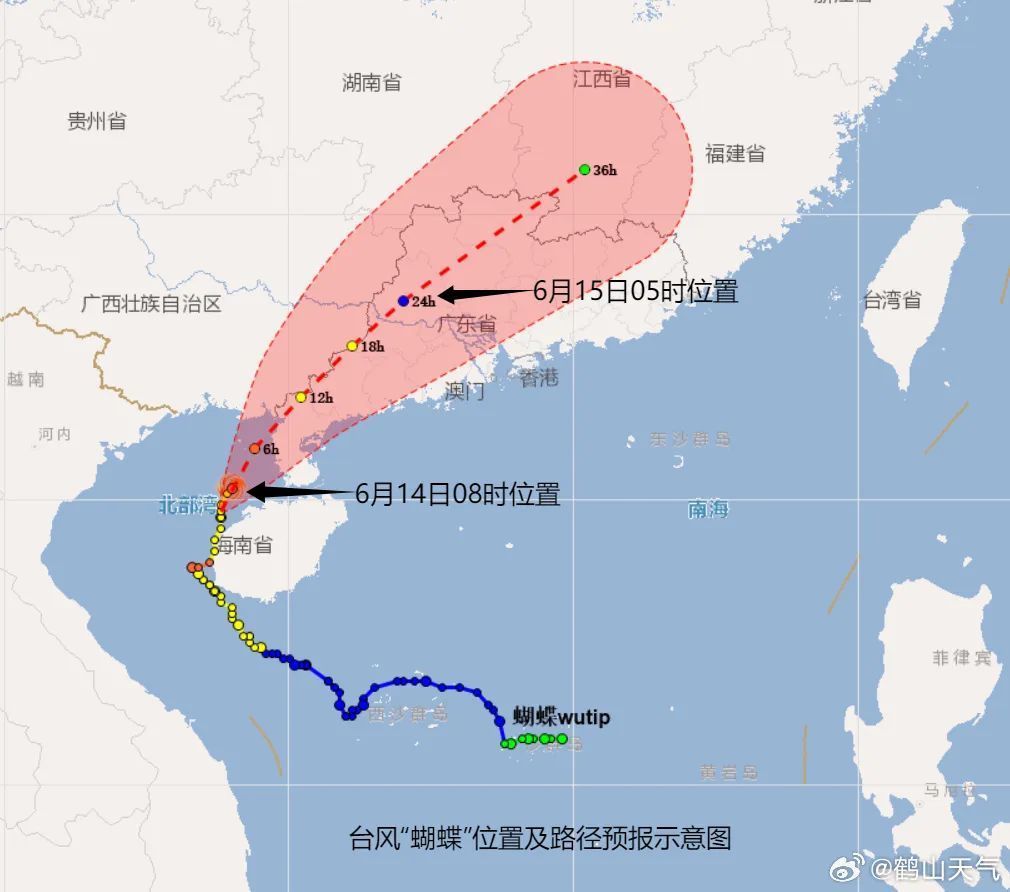 预计,“蝴蝶”将以每小时20公里左右的速度向东北方向移动,强度维持,将于14 日中午到下午在广东徐闻到广西北海沿海地区登陆,登陆后沿两广交界附近区域向东北方向移动。